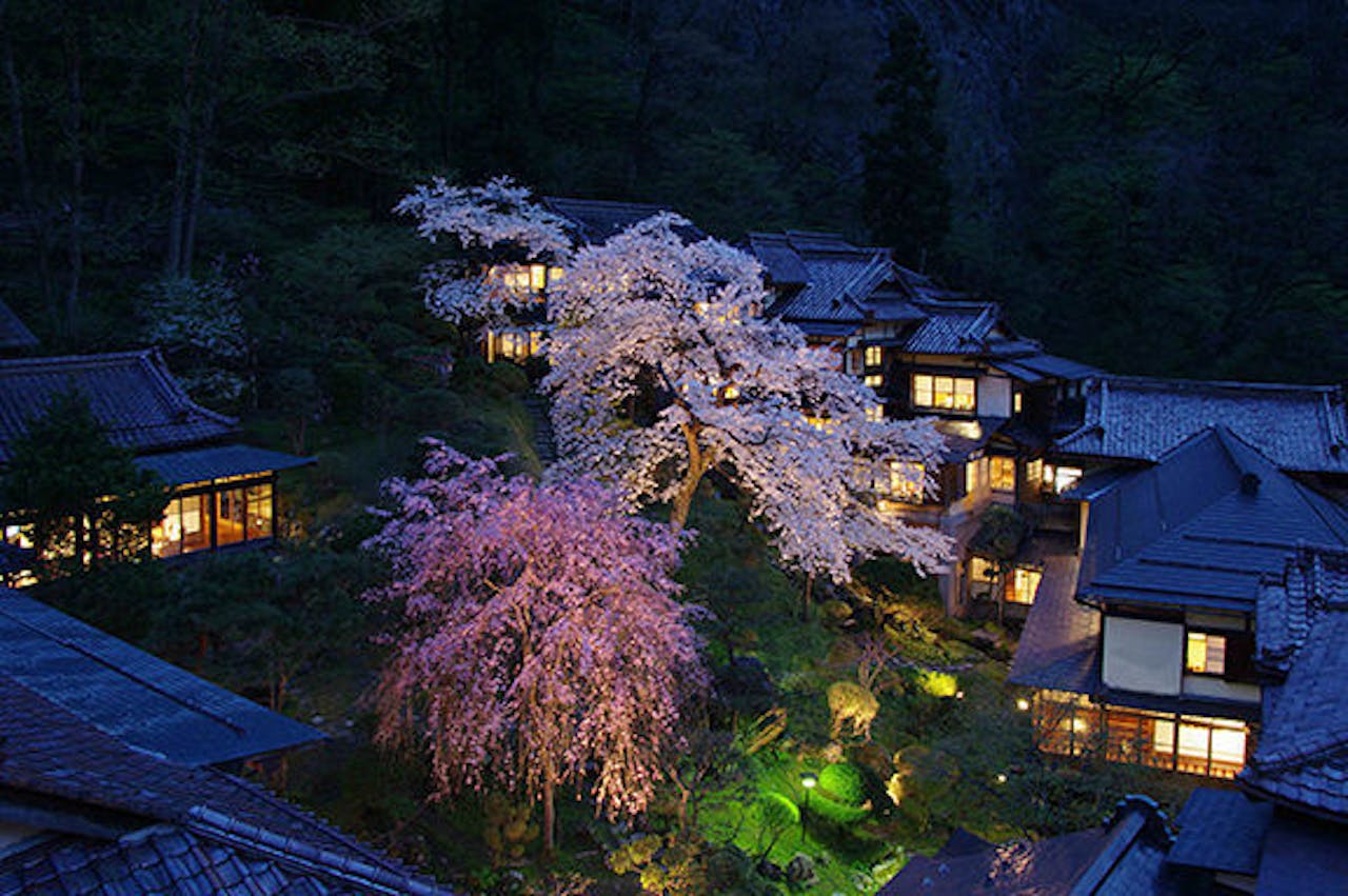 出典:一休.com 会津東山温泉 向瀧 (春)桜咲く中庭の景色