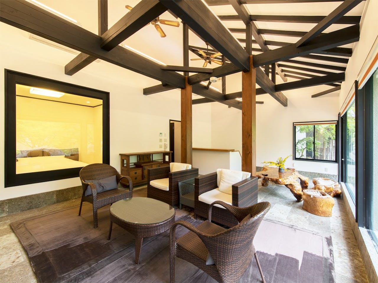 ・本館の客室は「テラス付き露天風呂+囲炉里+和室二間+書斎+内湯」の造りです。